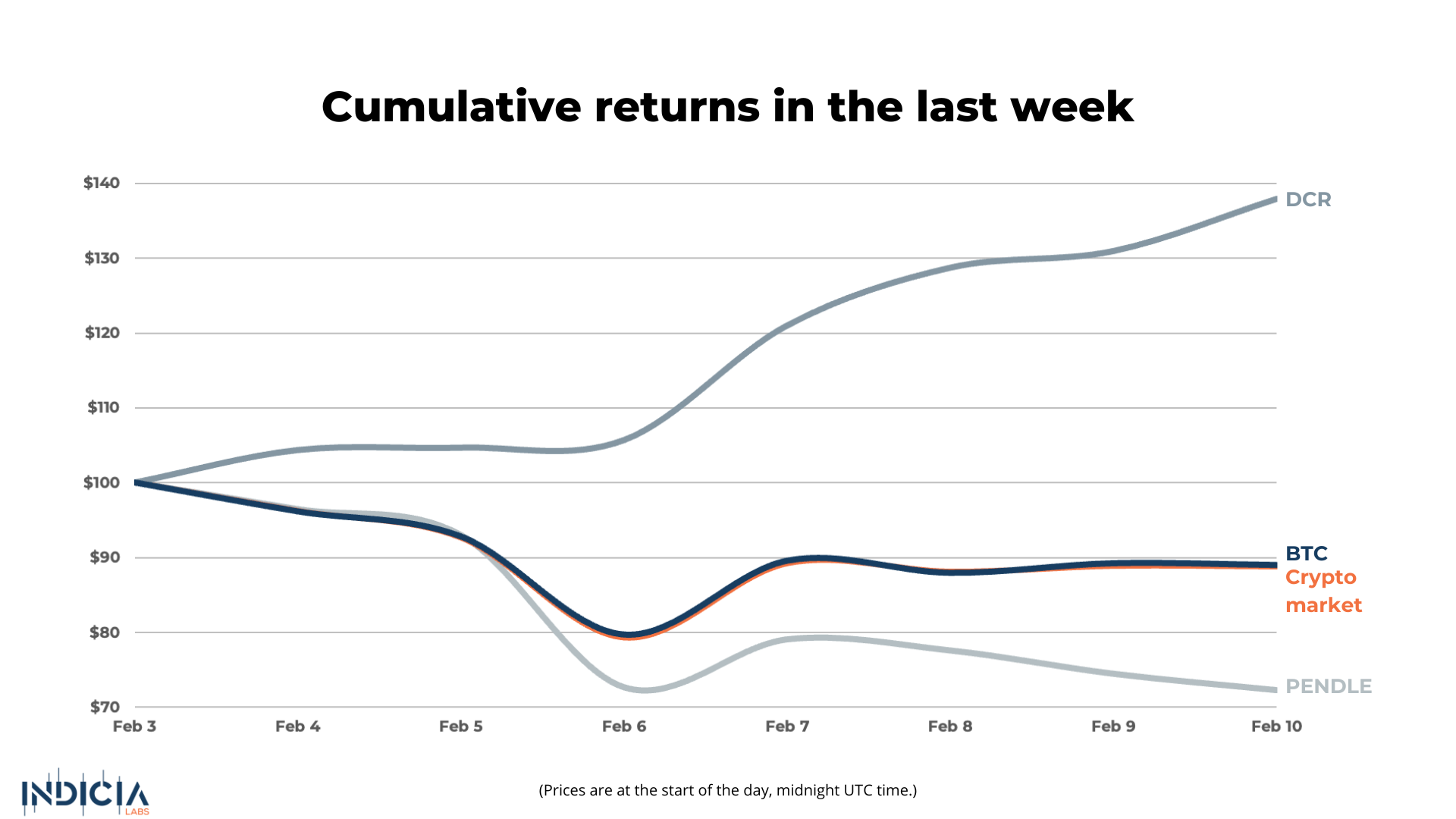 This week, the broader crypto market declined 11.2%, with Bitcoin (BTC) falling 11.0% as risk appetite remained fragile. Decred (DCR) stood out, rallying 37.9% against the broader downturn, while Pendle (PENDLE) underperformed sharply, dropping 27.7% amid continued selling pressure.