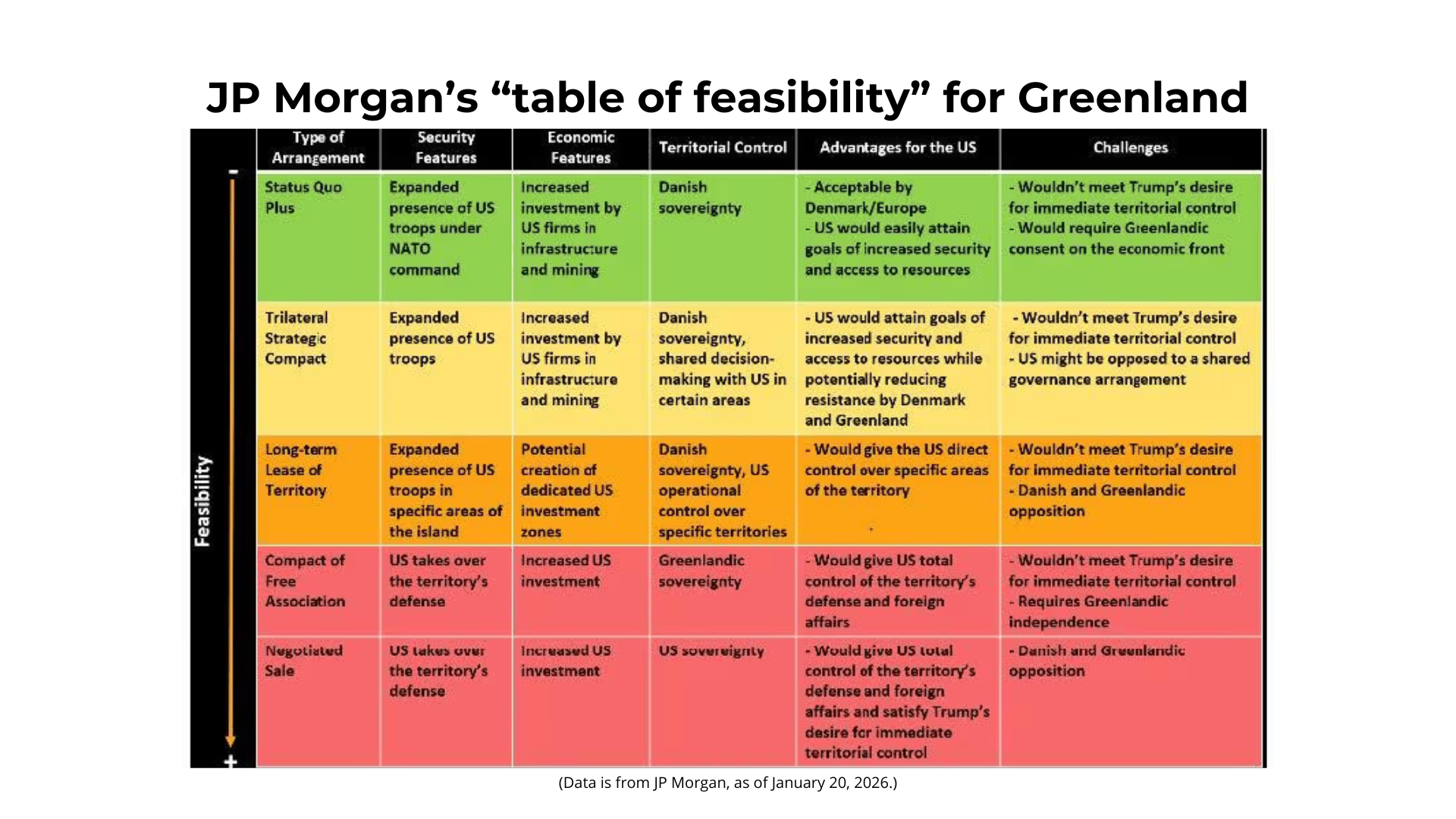 For now, the base case remains de-escalation. A JPMorgan International Market Intelligence note framed the situation succinctly, observing that Trump “creates noise and throws in a maximal stance designed to trigger negotiation and create leverage,” while concluding that “the most likely outcome remains a negotiated arrangement.”