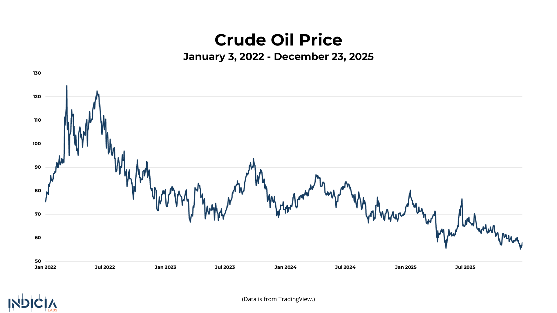 Energy prices provide another supporting signal. Crude oil prices have continued to trend lower, and energy remains a key input cost across transportation, manufacturing, and logistics. Historically, oil prices have shown a strong correlation with headline CPI, and sustained declines in energy costs tend to feed through to broader inflation measures over time.