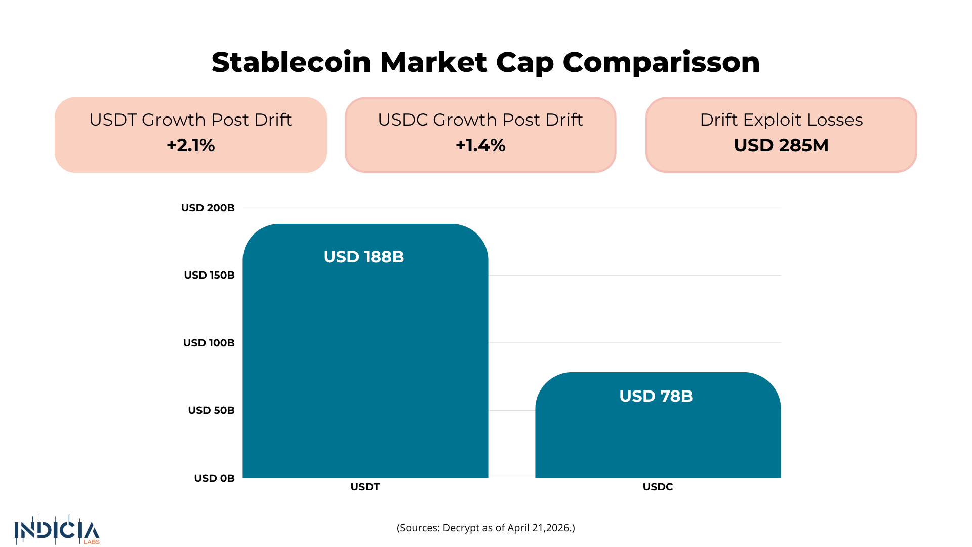 The market response was measurable. Since the Drift exploit, USDT's market cap grew 2.1% to nearly USD 188 billion, reaching an all-time high that Tether's Paolo Ardoino confirmed on April 21 with a post on X simply reading "188B USDT (ATH)." USDC's total value rose at a slower rate over the same period, gaining 1.4% to USD 78.25 billion, according to DefiLlama data cited by Decrypt. The gap between the two stablecoins, already substantial, widened further. The timing suggests these stress events may have accelerated a pre-existing preference for USDT's liquidity, rather than representing a clean behavioral break from prior patterns.