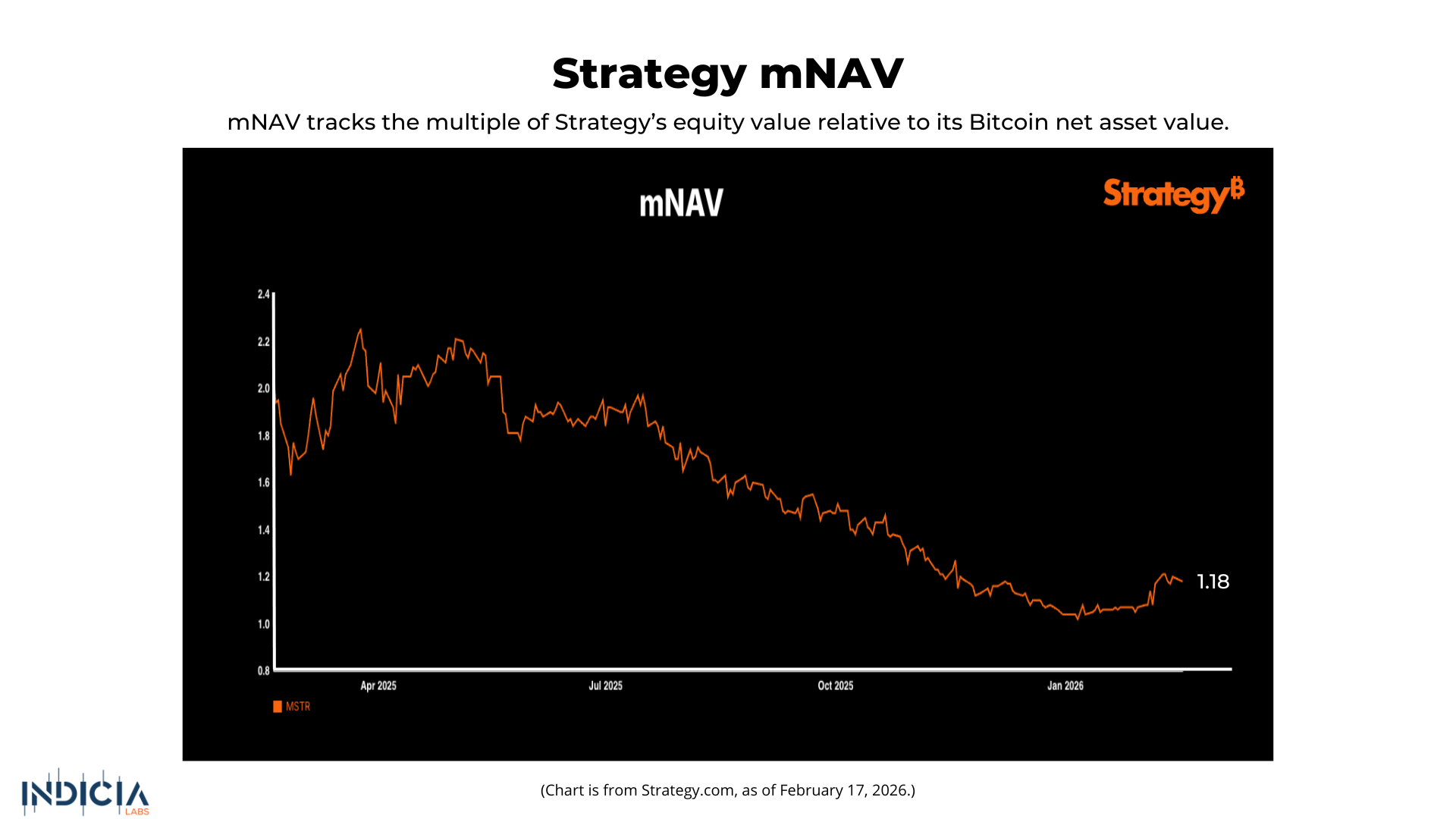 Strategy now holds over 717,000 BTC but sits billions underwater, with its holdings “about $5.7 billion” below cost and the company reporting “a 12.4 billion fourth-quarter loss.” Yet management’s response has remained unchanged. On February 10, Saylor said on CNBC’s Squawk Box that “We’ll refinance the debt. We’ll just roll it forward.” The company funds purchases through equity issuance, convertible debt, and preferred shares, including a USD 3.4 billion preferred program paying 11.25% dividends. Despite the suffering balance sheet, Saylor maintains conviction in Strategy’s playbook, stating that “I expect we’ll be buying bitcoin every quarter forever.” At present, Strategy’s mNAV (calculated by dividing Enterprise Value by the BTC Reserve) lies at 1.18.