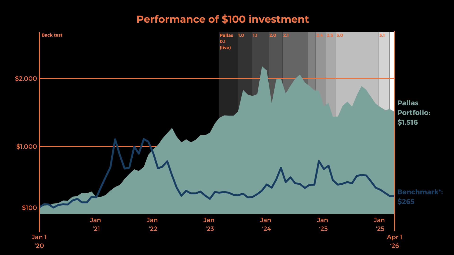 (*: The benchmark is a passive basket of the same coins in the investment universe of the Pallas Portfolio, equally-weighted and rebalanced daily.)