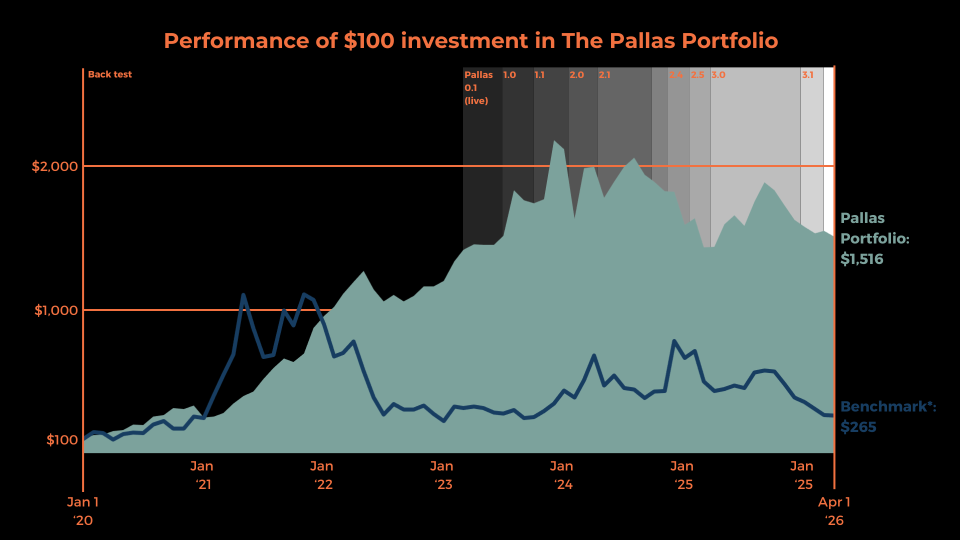 (Last updated: April 1, 2026. *: The benchmark is a passive basket of the same coins in the investment universe of the Pallas Portfolio, equally-weighted and rebalanced daily.)